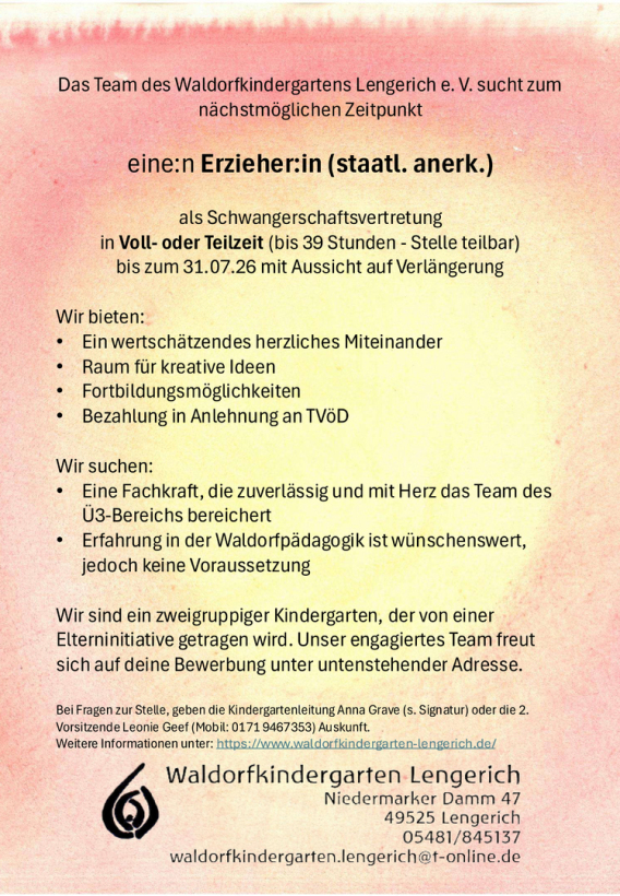 Bewirb dich unkompliziert und schick deine Bewerbung per E-Mail an Anna Grave.(waldorfkindergarten.lengerich@t-online.de)